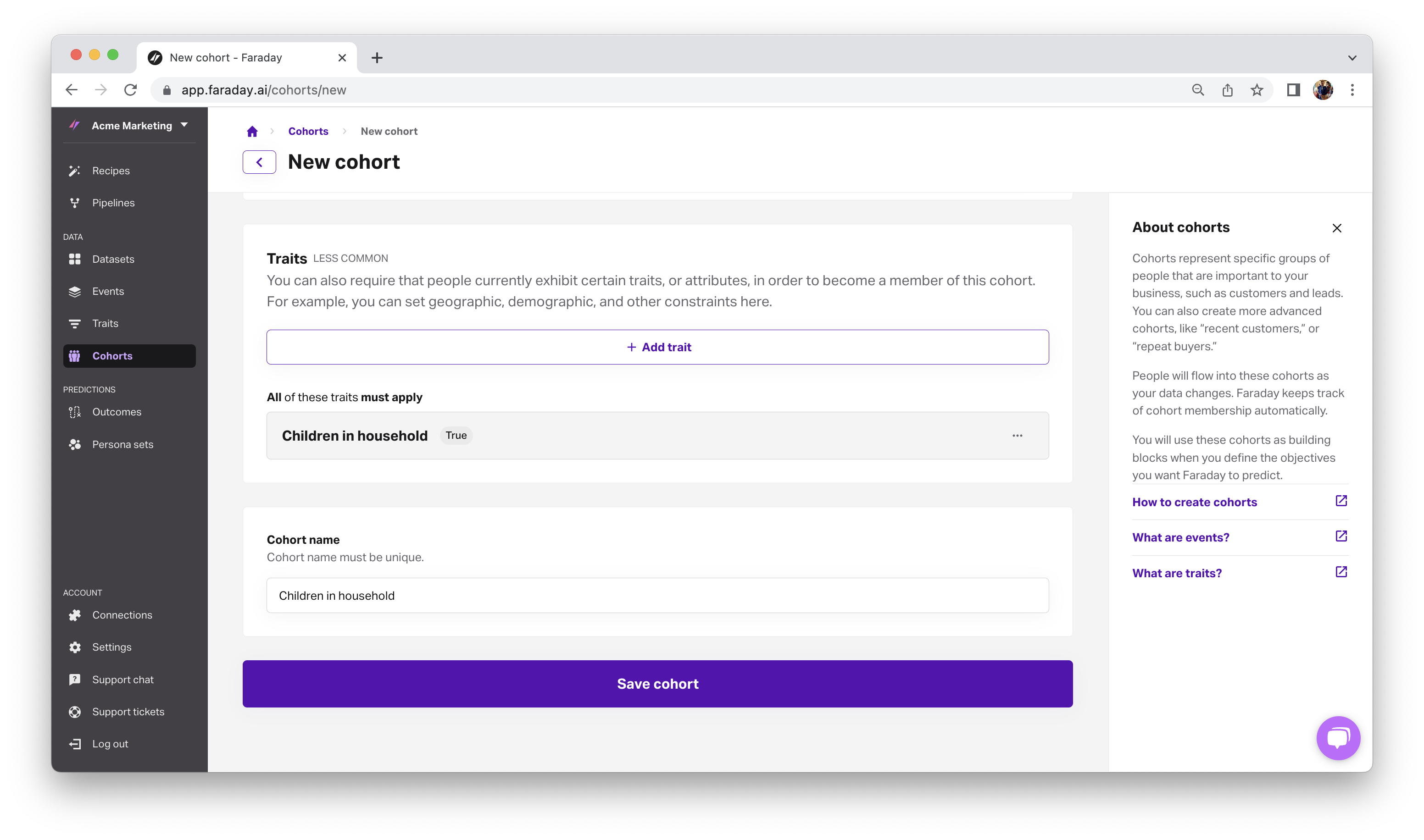Then, in cohorts, you’ll utilize both your customer data and Faraday’s built-in consumer data to build the exact cohort–or interesting group of people–you want. To continue with the nursery humidifier example, you’ll define a cohort for your customers, and a cohort using the trait for children in household, sourced from Faraday’s rich, cookieless, opt-in consumer data, to target with your propensity to buy predictions.