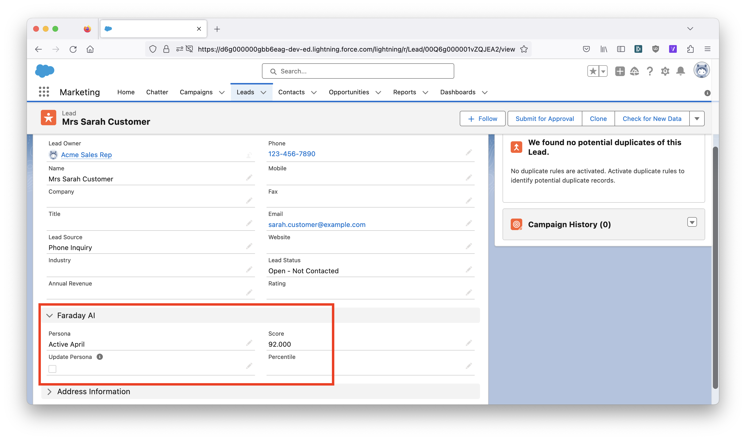 With Faraday, you can implement predictive lead scoring in Salesforce in a day, including scoring brand new leads in real-time as they come in–something Einstein lead scoring can’t do–regardless of where your data is. Here’s how it works.